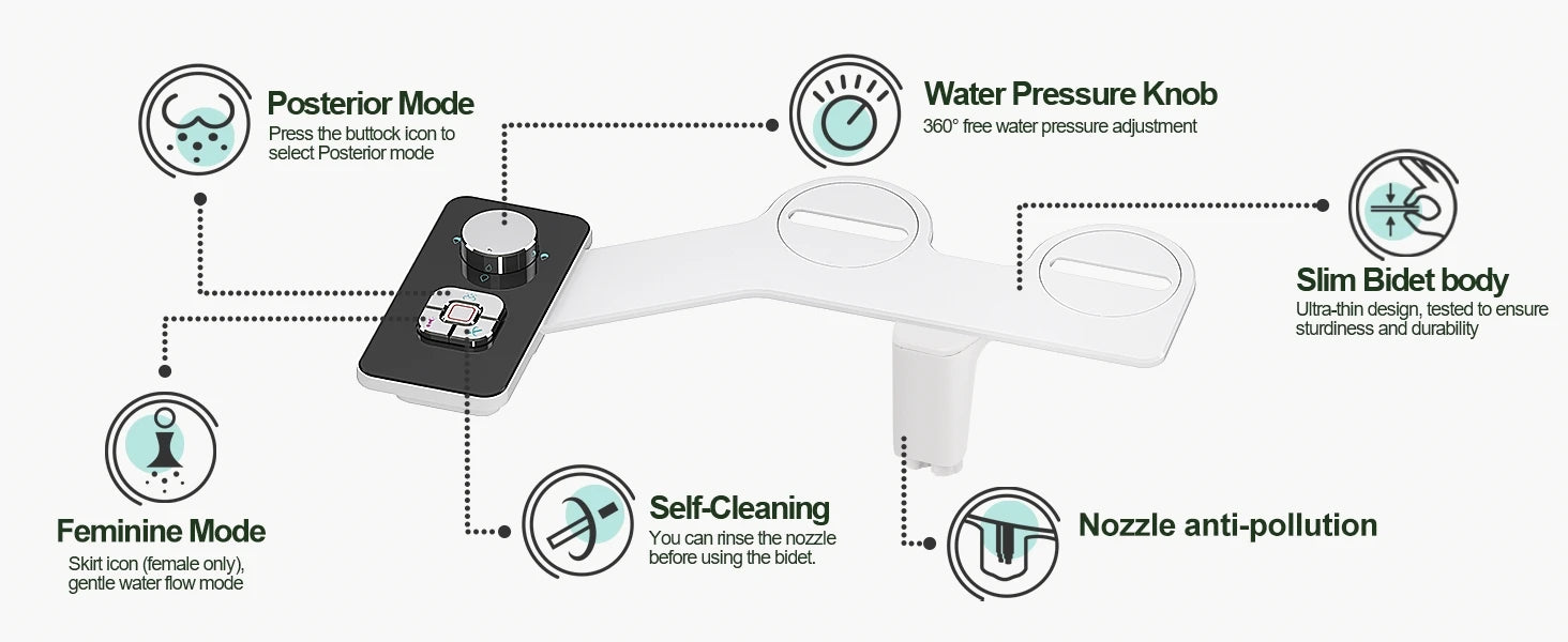 Feature: Eco-friendly non-electric design, hygienic dual wash, sleek ultra-thin body